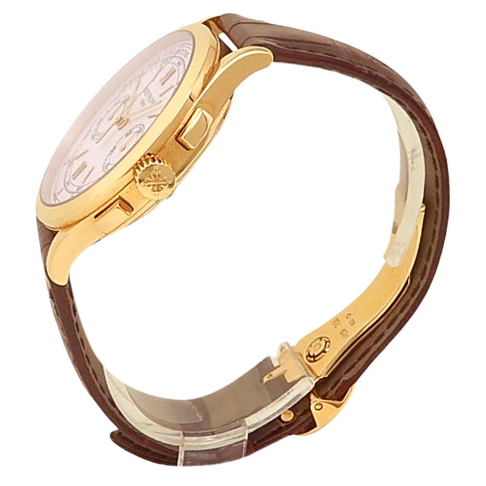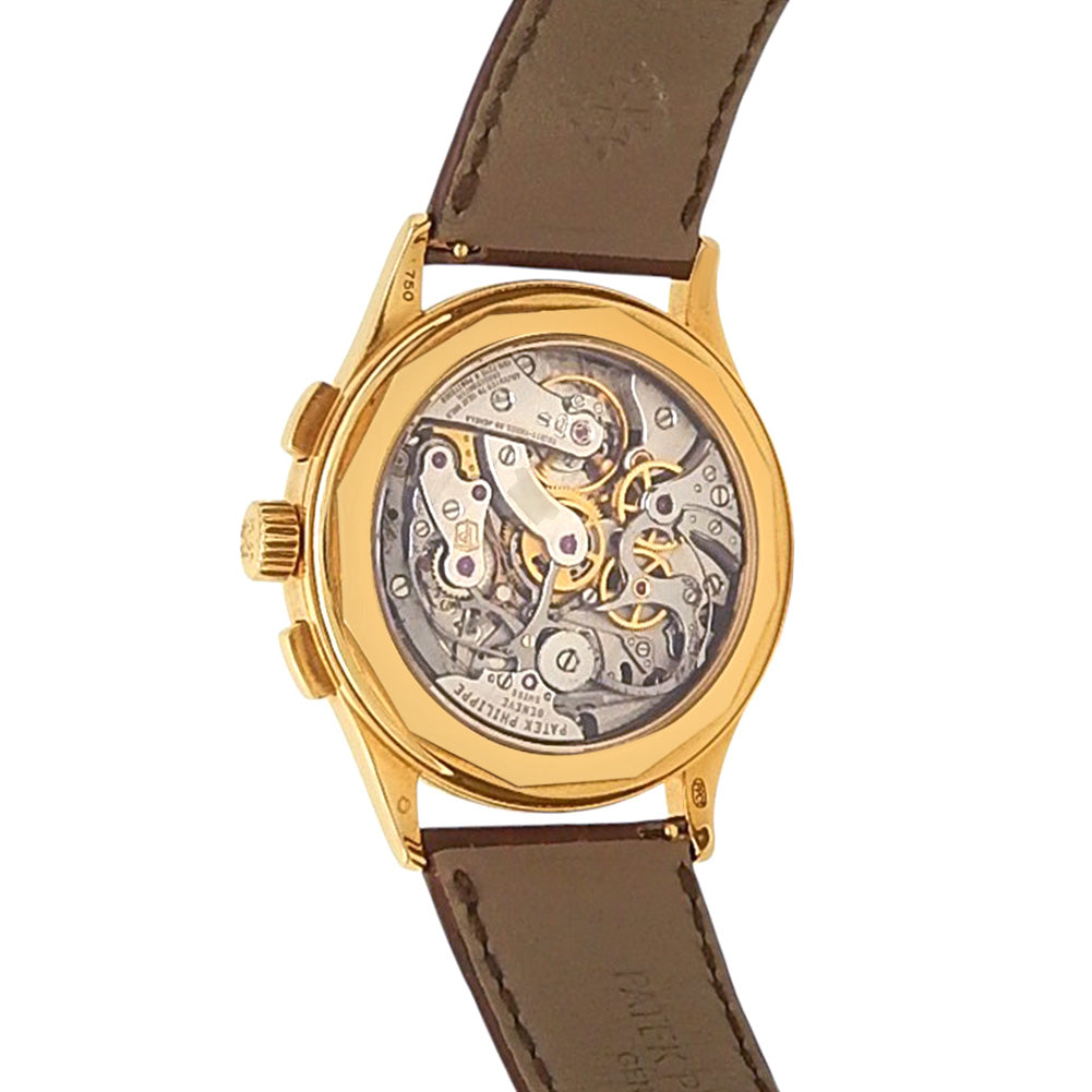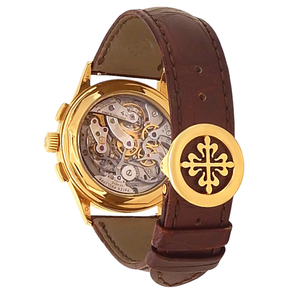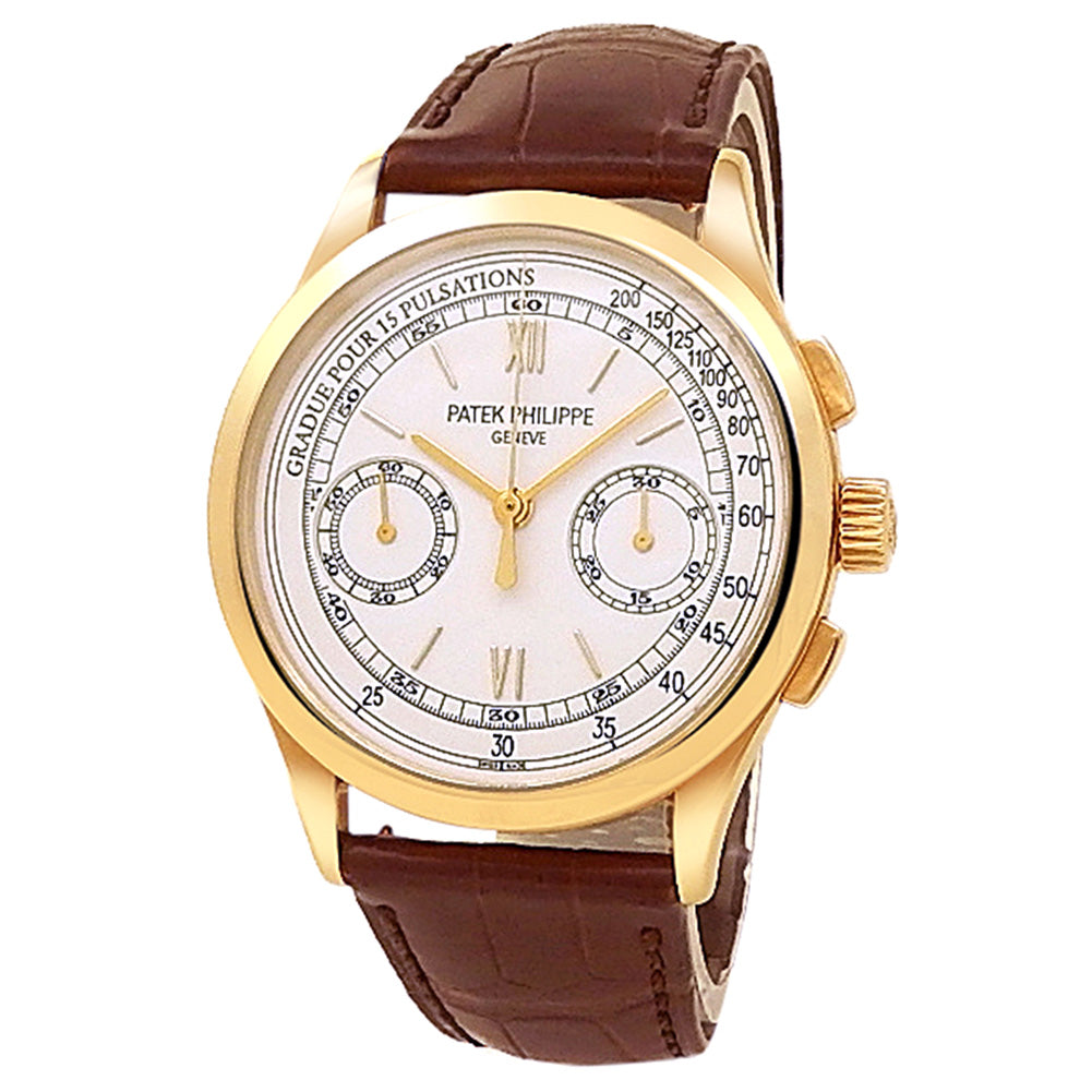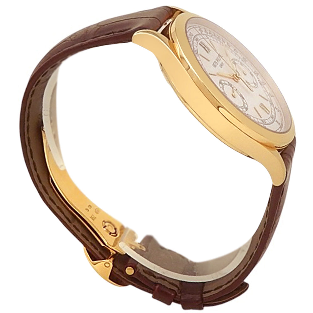 Pre-Owned Watch. Patek Philippe Complications Chronograph men’s watch with 18k Yellow Gold case and Brown Leather strap. Watch has a silver dial with chronograph feature. Watch runs on manual movement. Watch has signs of wear (hairline scratches).