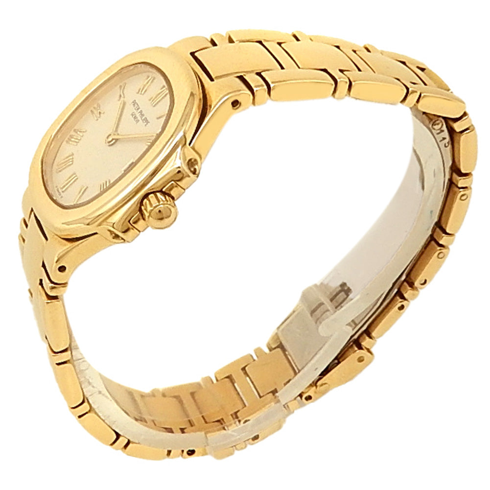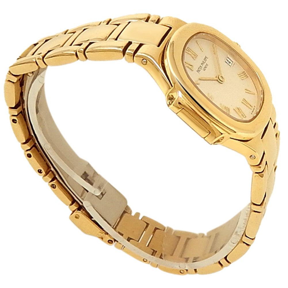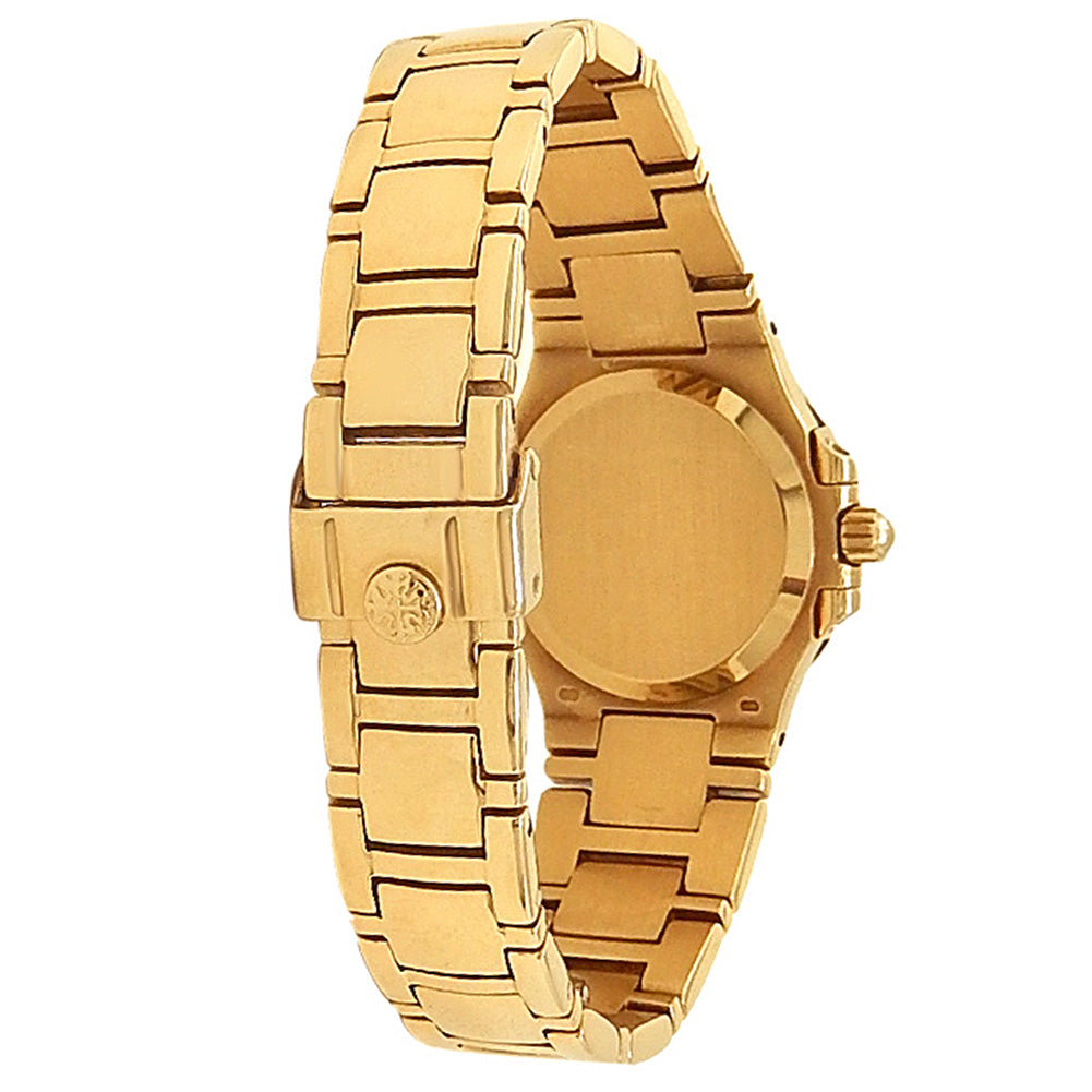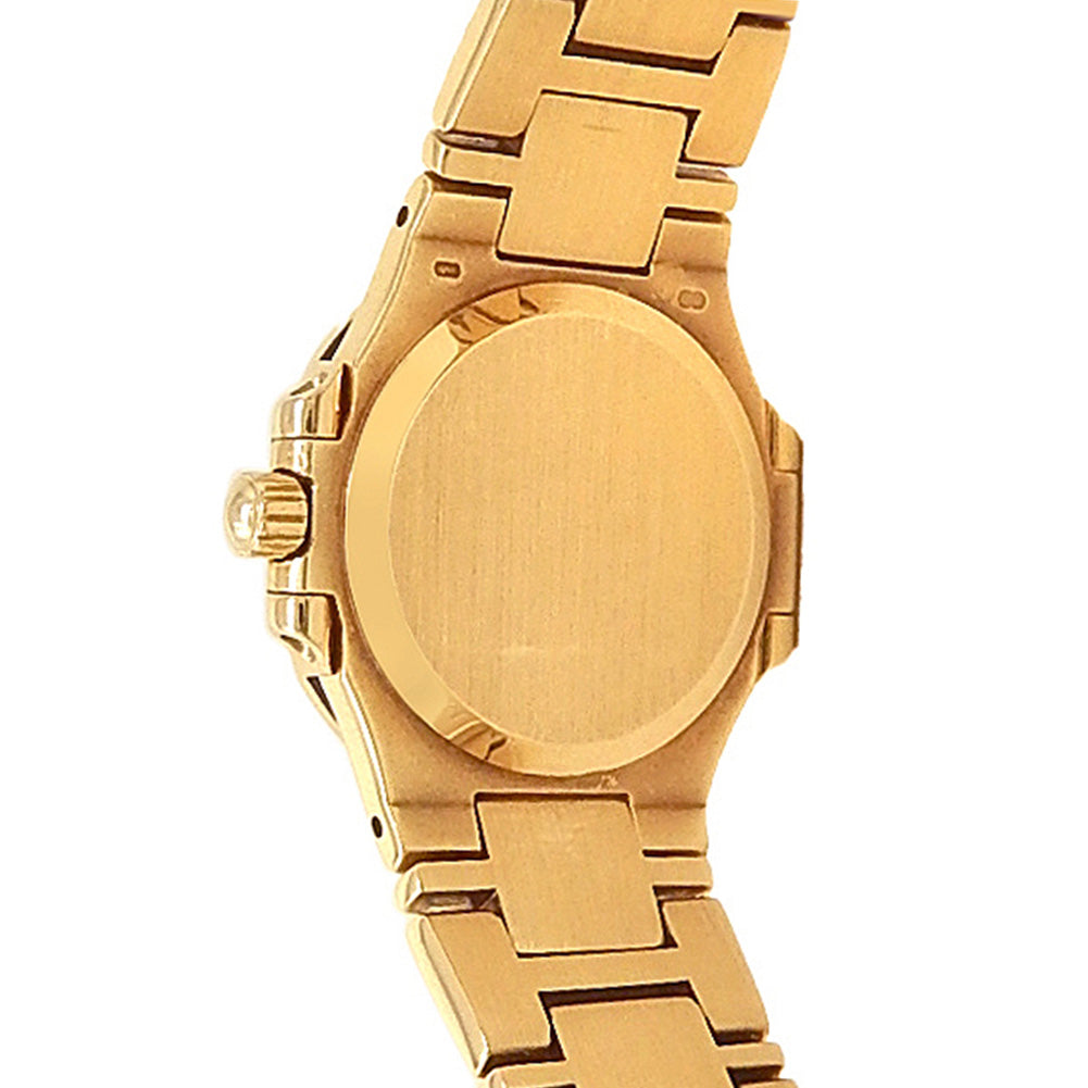 Pre-Owned Watch. Patek Philippe Nautilus ladies watch with 18k Yellow Gold case and bracelet. Watch has a white ivory dial with date feature. Watch runs on quartz movement. Watch can fit up to a size 5¾ inch wrist. Watch has signs of wear (hairline scratches). Watch does come with papers.