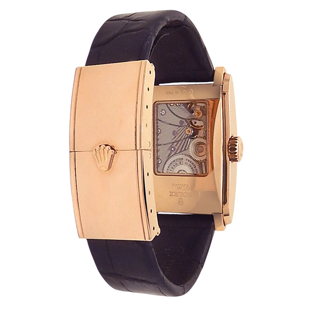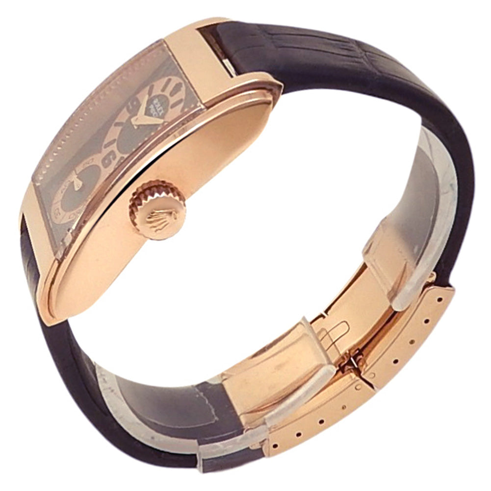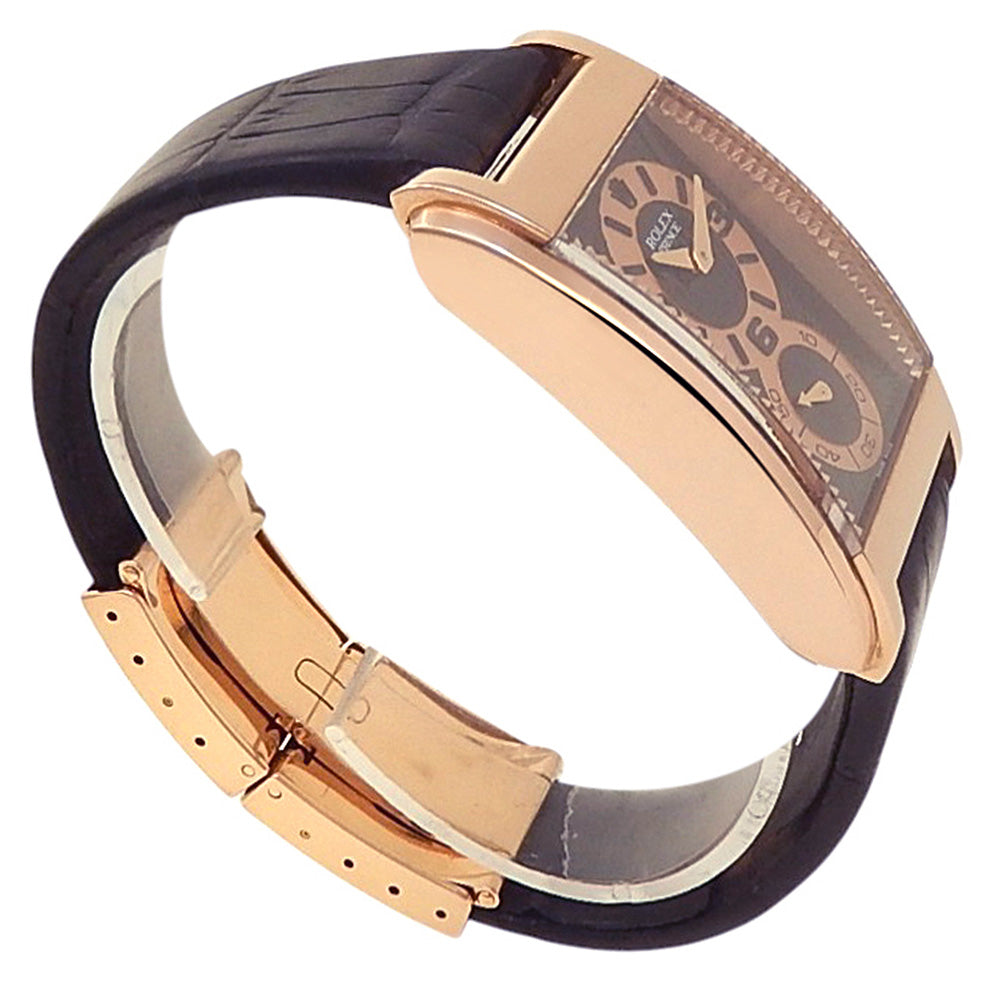 Pre-Owned Watch. Rolex Cellini Prince men’s watch circa 2008 with 18k Rose Gold case and Black Leather strap. Watch has a black & rose gold dial with small seconds subdial. Watch runs on manual movement. Watch has signs of wear (hairline scratches). Watch does come with box.