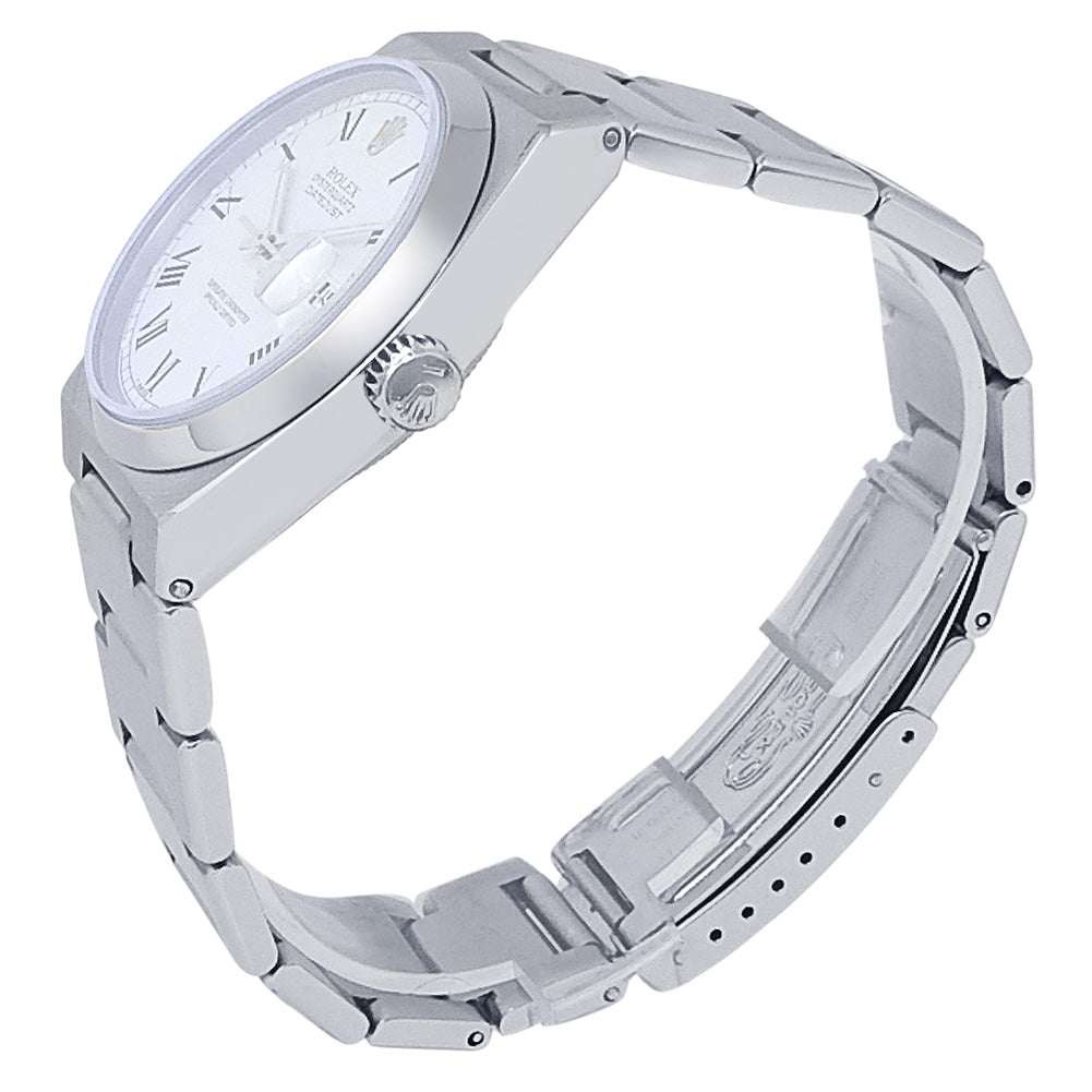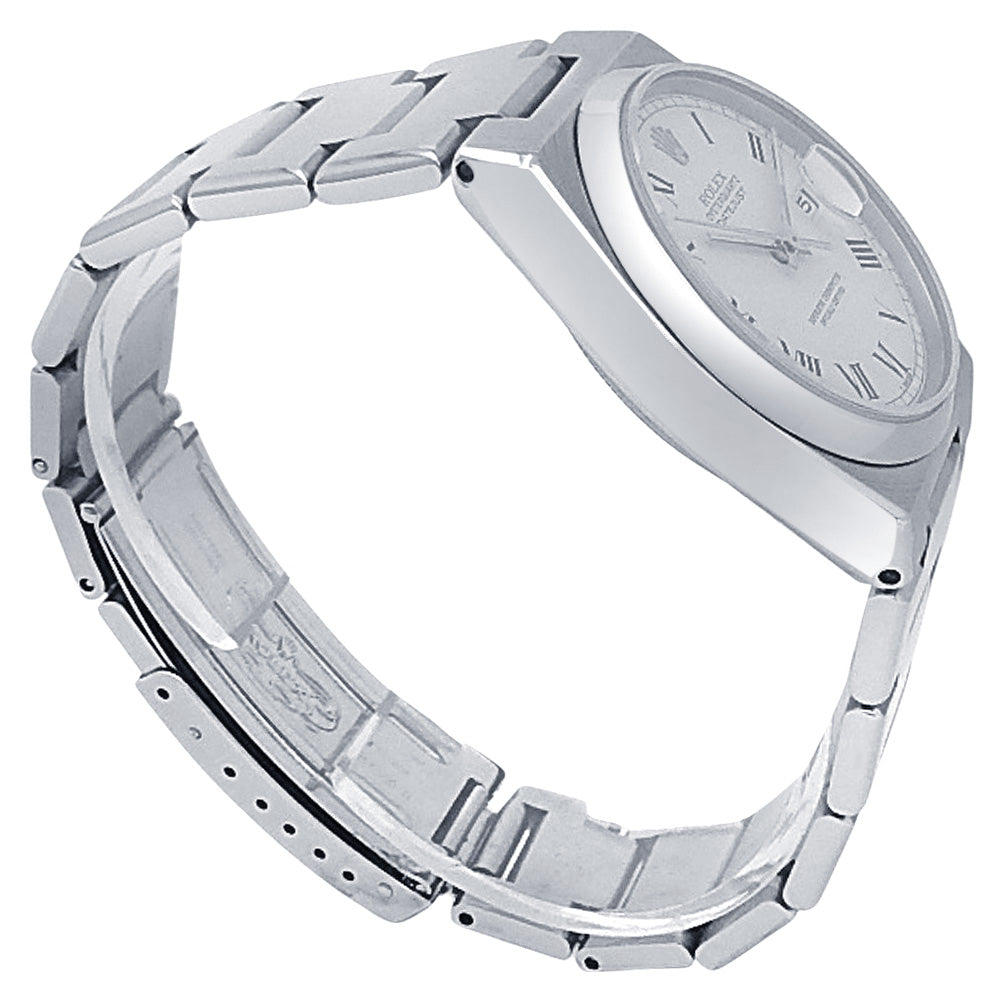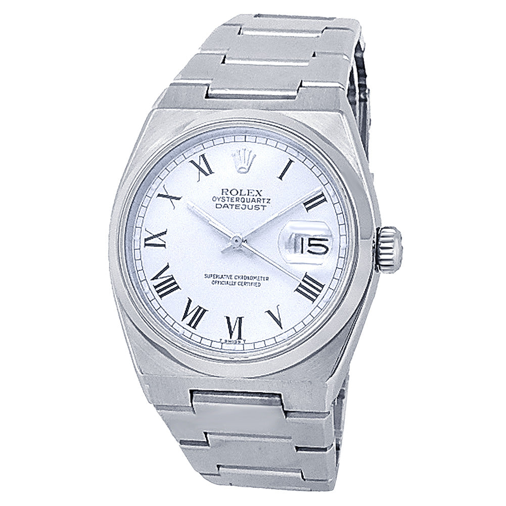 Pre-Owned Watch. Rolex Datejust Oysterquartz men’s watch circa 1983 with Stainless Steel case and Integrated bracelet. Watch has a white dial with date feature. Watch runs on quartz movement. Watch can fit up to a size 7¼ inch wrist. Watch has signs of wear (hairline scratches). Watch does come with box.