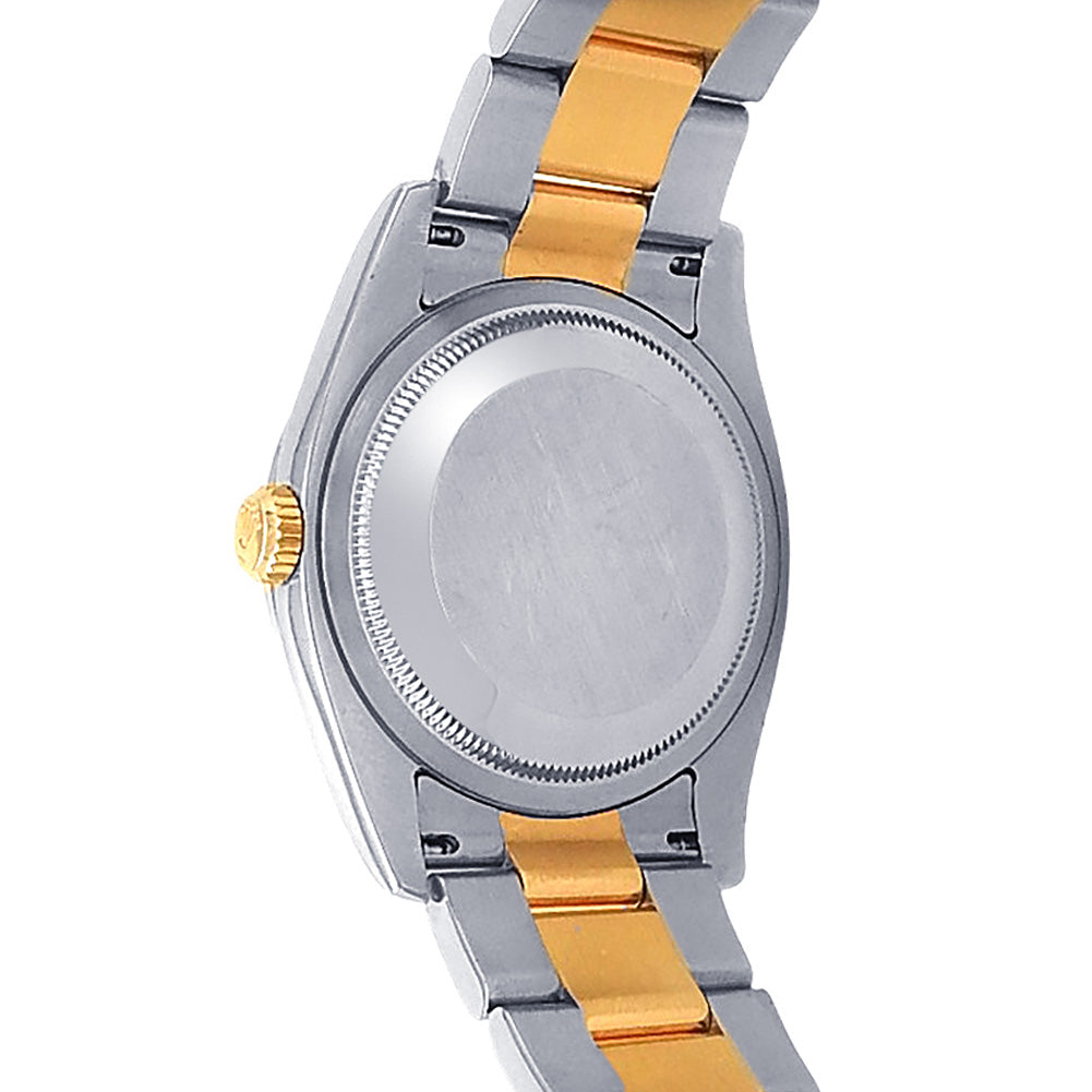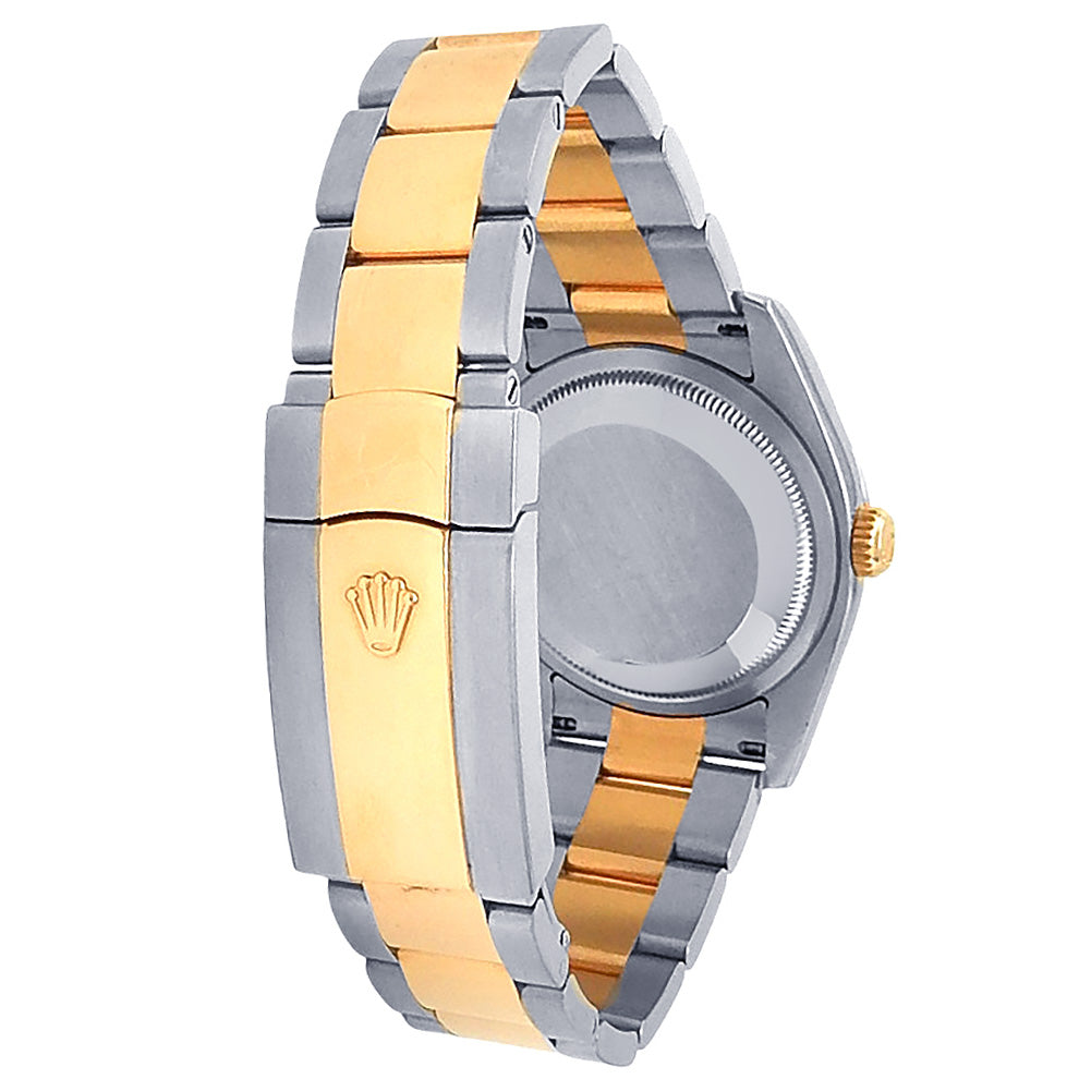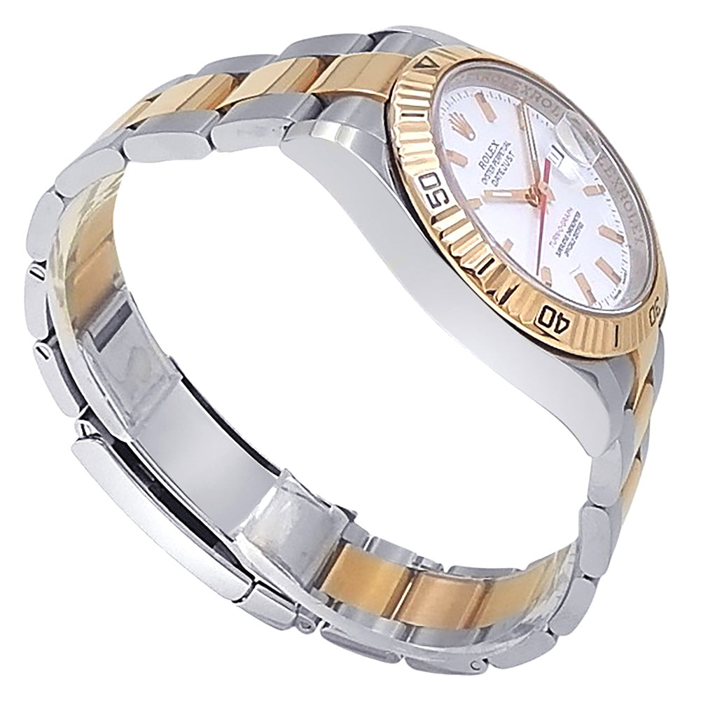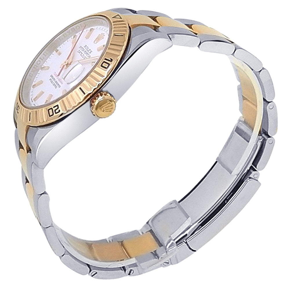 Pre-Owned Watch. Rolex Datejust Turn-O-Graph men’s watch circa 2006 with 18k Everose Gold & Stainless Steel case and Oyster bracelet. Watch has a white dial with date feature and thunderbird bezel. Watch runs on automatic movement. Watch can fit up to a size 7½ inch wrist. Watch has signs of wear (hairline scratches). Watch does come with box and papers.