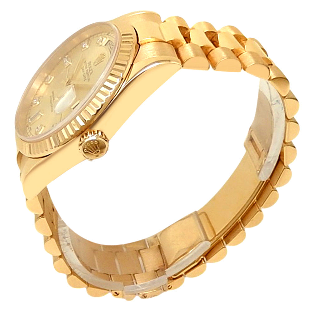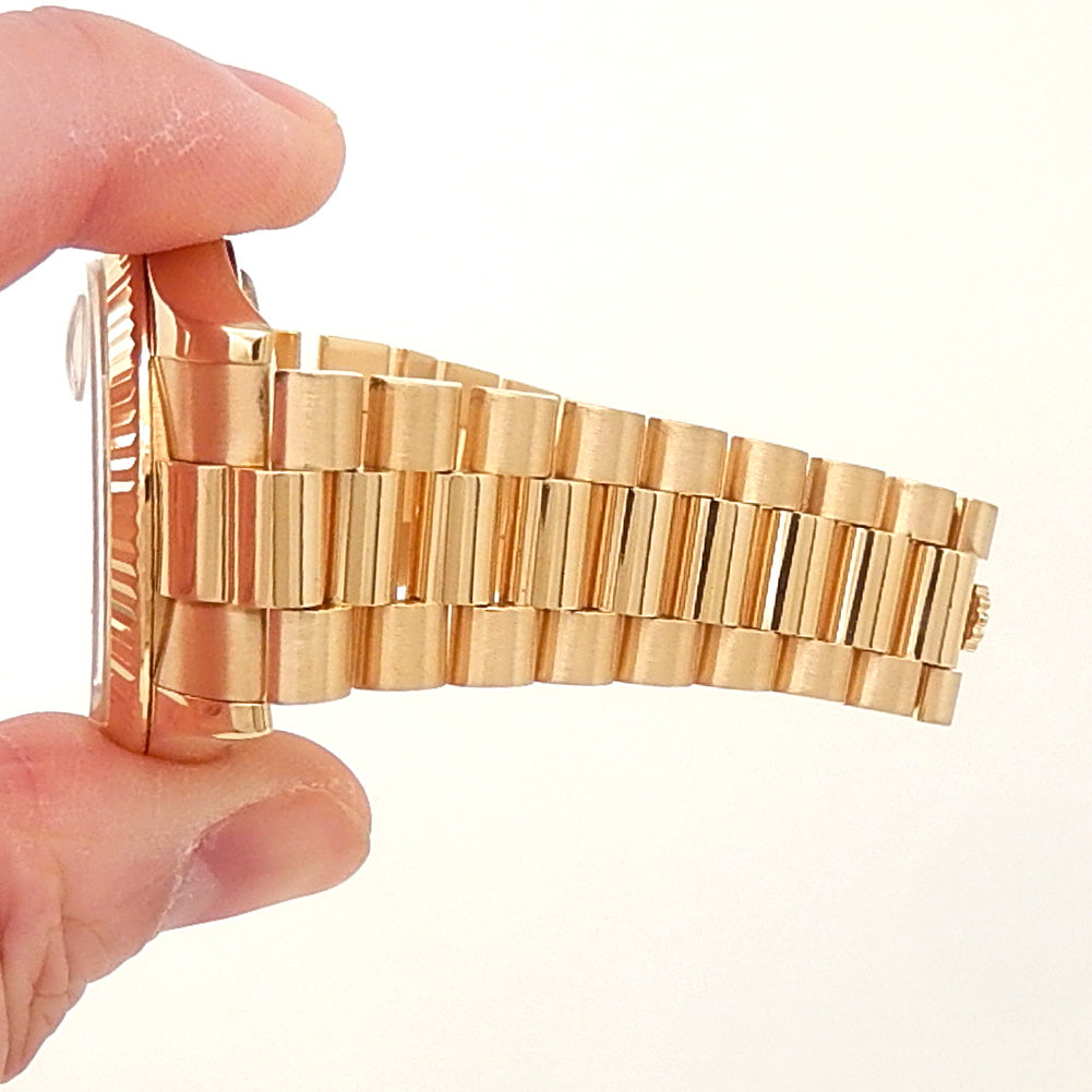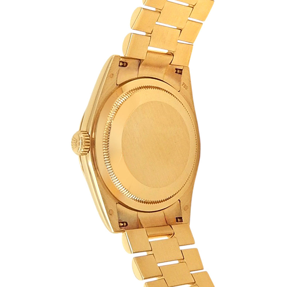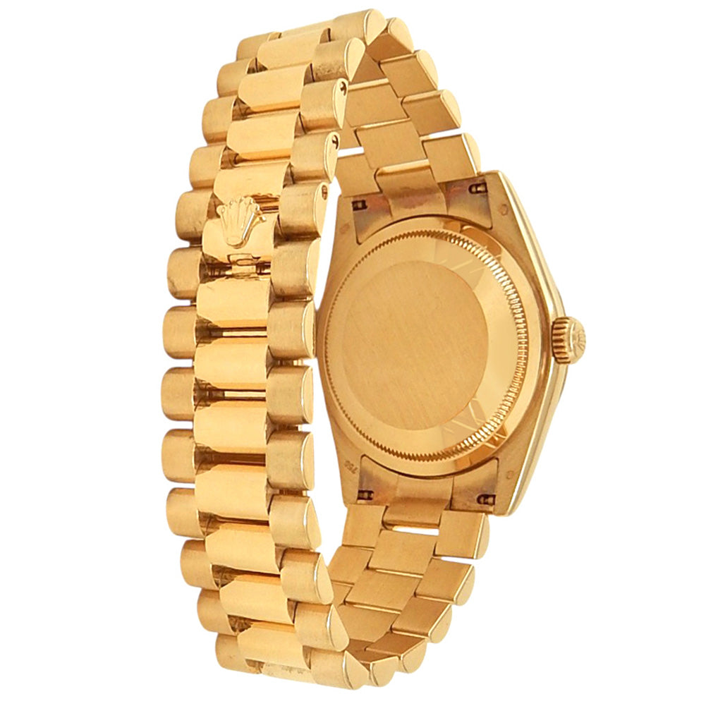 Pre-Owned Watch. Rolex Day-Date men’s watch circa 2003 with 18k Yellow Gold case and President bracelet. Watch has a champagne dial with date, day features and diamond markings. Watch runs on automatic movement. Watch can fit up to a size 7 inch wrist. Watch has signs of wear (hairline scratches). Watch does come with box.