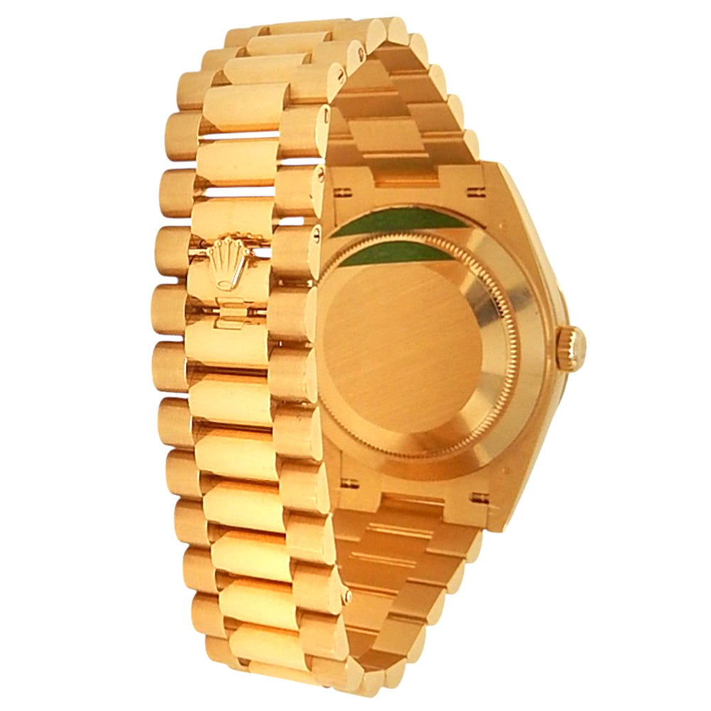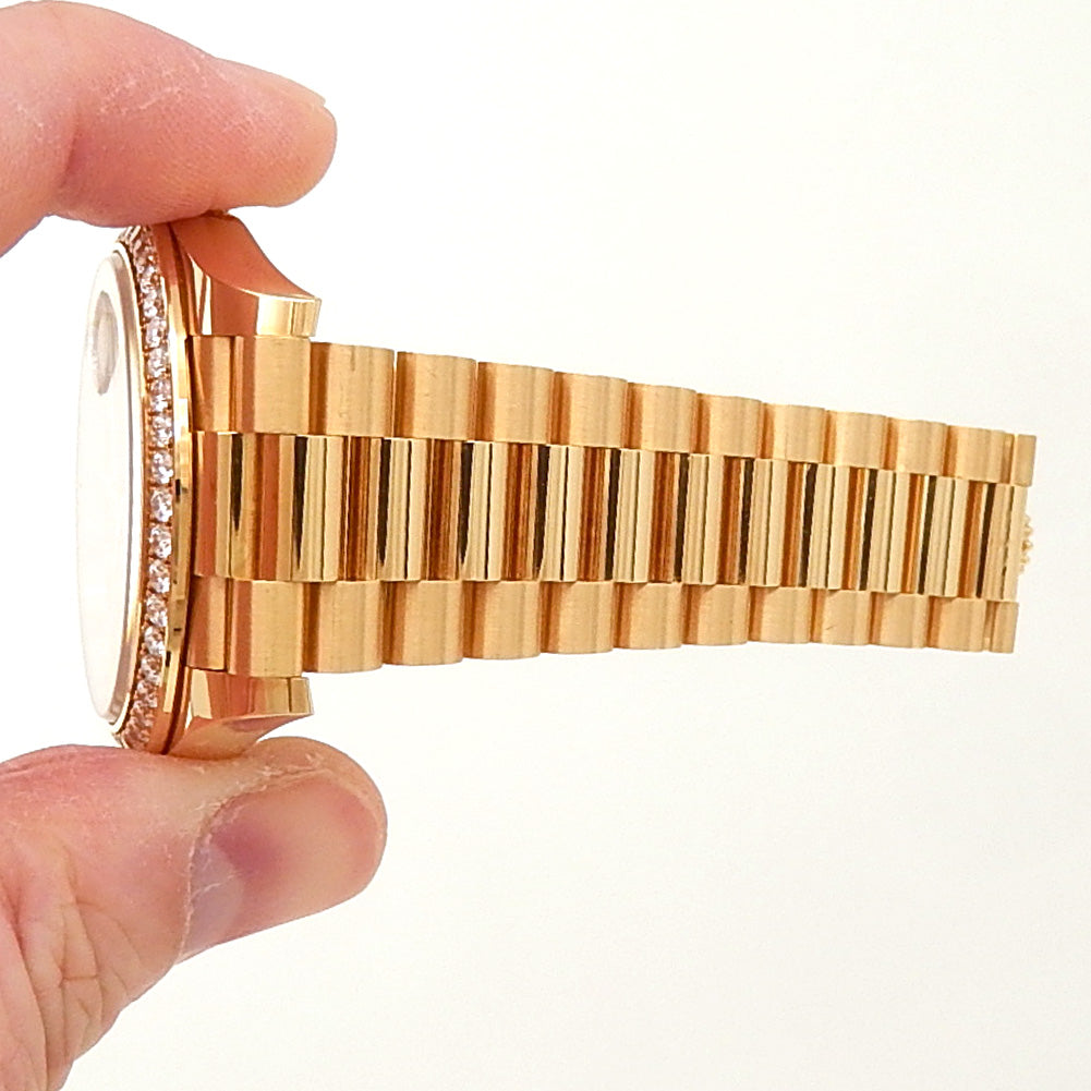 Pre-Owned Watch. Rolex Day-Date men’s watch with 18k Yellow Gold case and President bracelet. Watch has a champagne dial with date, day features, baguette diamond markings and diamonds bezel. Watch runs on automatic movement. Watch can fit up to a size 7½ inch wrist. Watch has signs of wear (hairline scratches). Watch does come with box and card.