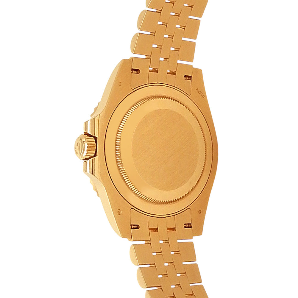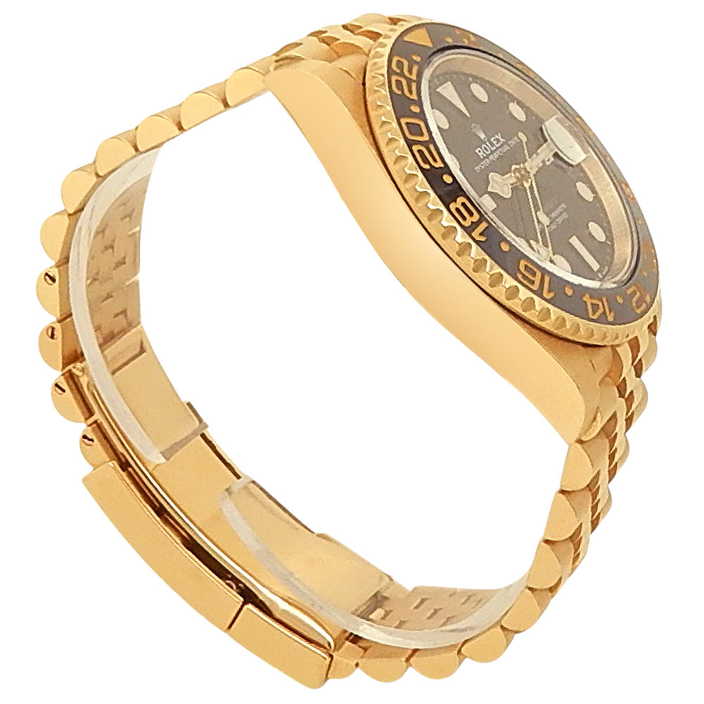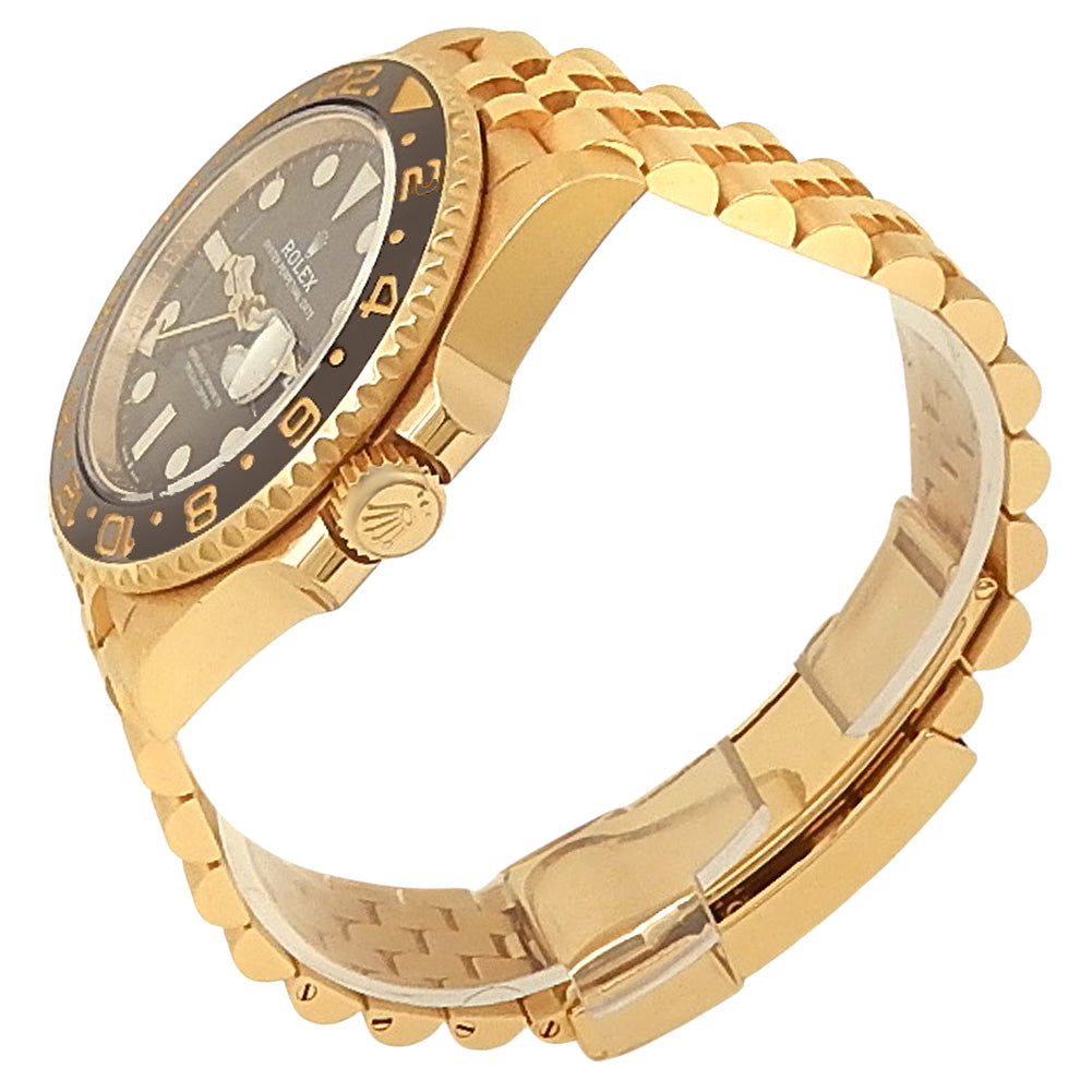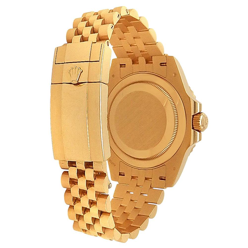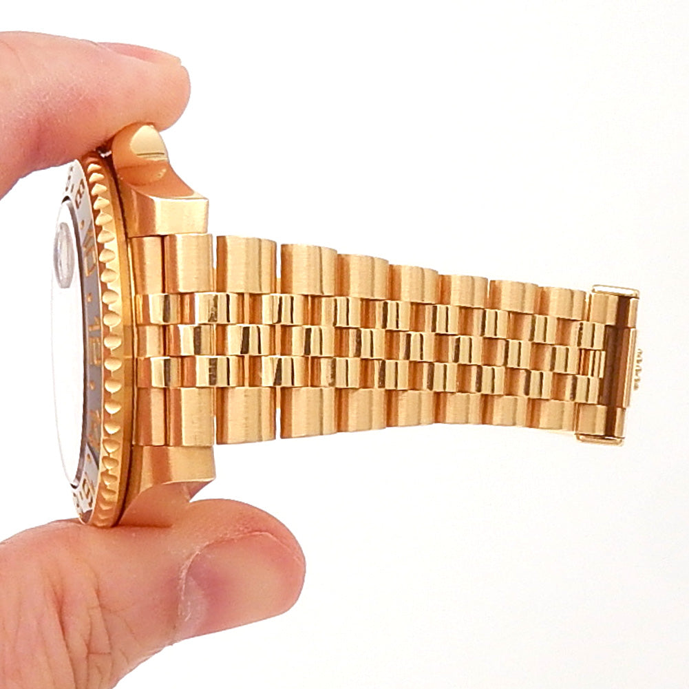Pre-Owned Watch. Rolex GMT-Master II men’s watch with 18k Yellow Gold case and Jubilee bracelet. Watch has a black dial with date feature. Watch runs on automatic movement. Watch can fit up to a size 7 inch wrist. Watch has signs of wear (hairline scratches). Watch does come with box and card.