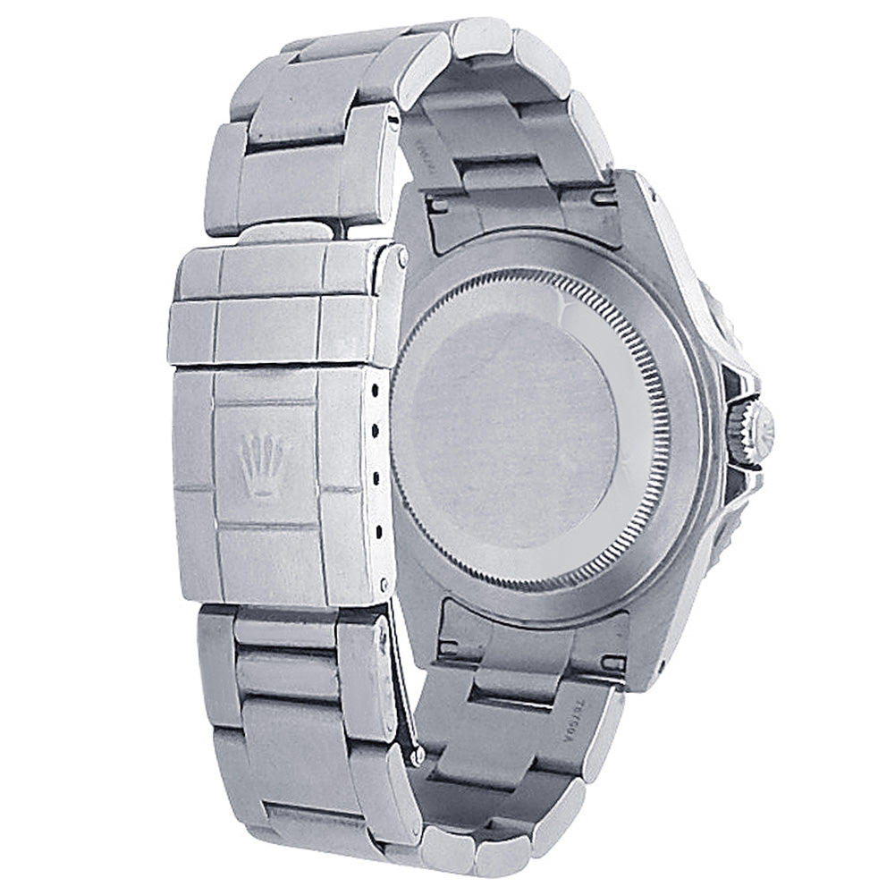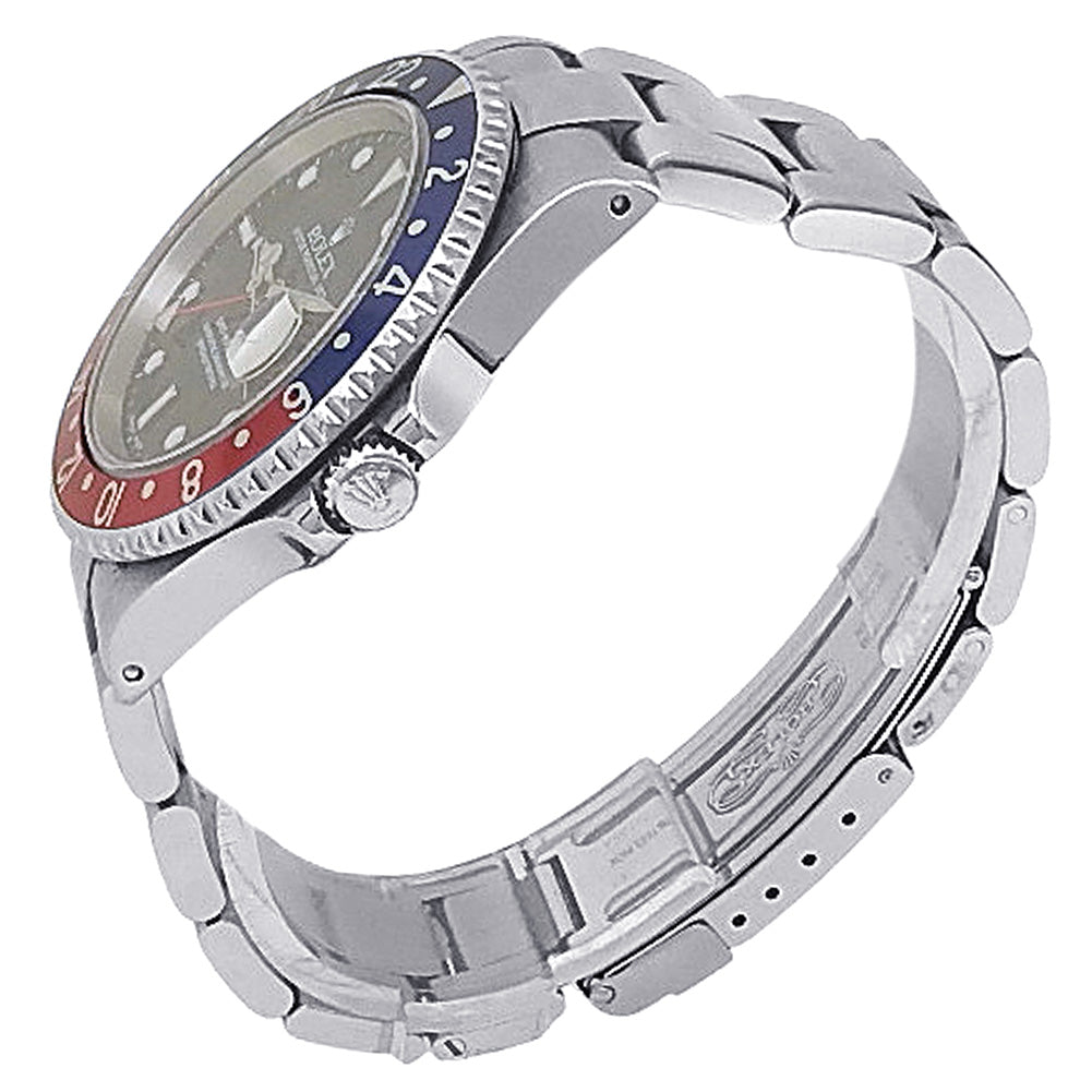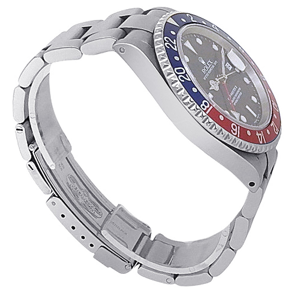 Pre-Owned Watch. Rolex GMT-Master II Pepsi men's watch circa 2002 with Stainless Steel case and Oyster bracelet. Watch has a black dial with date feature and pepsi bezel. Watch runs on automatic movement. Watch can fit up to a size 7 inch wrist. Watch had signs of wear (hairline scratches). Watch does come with box and papers.