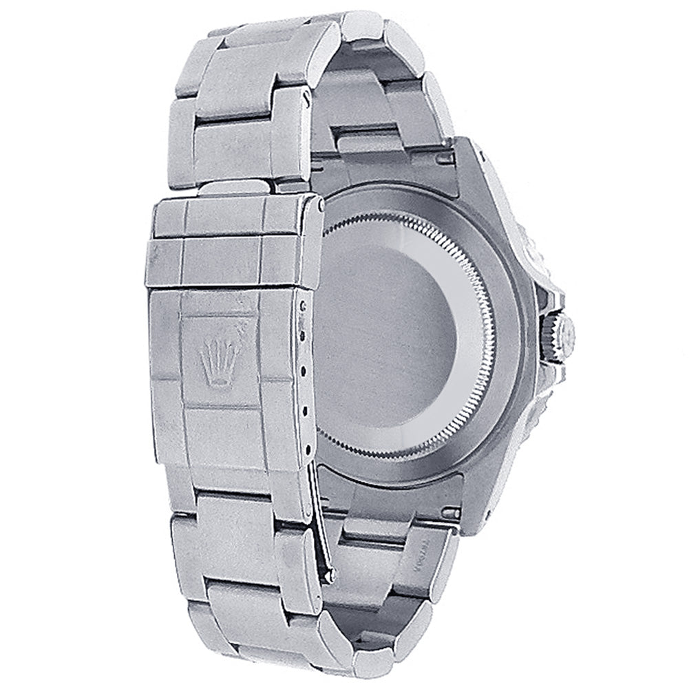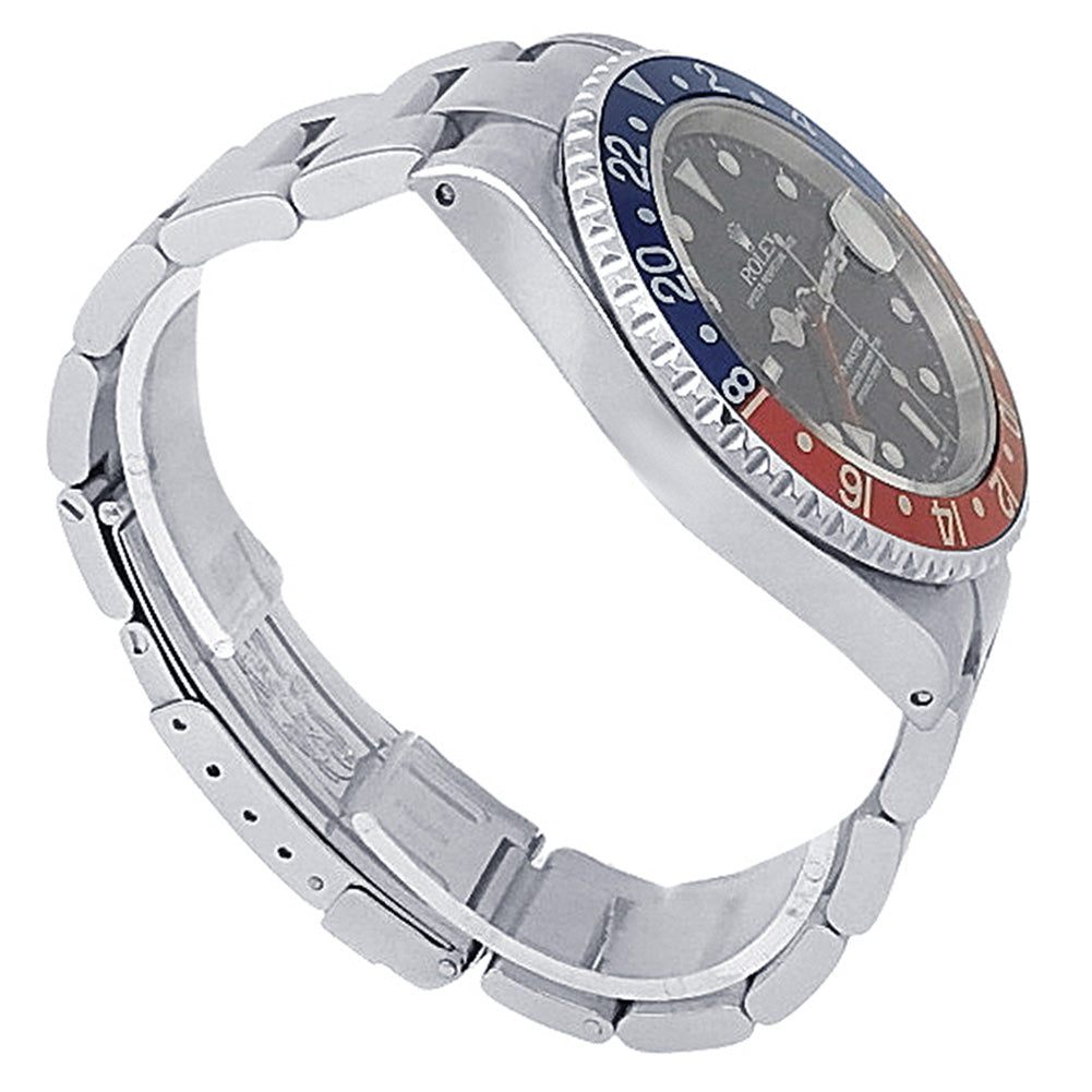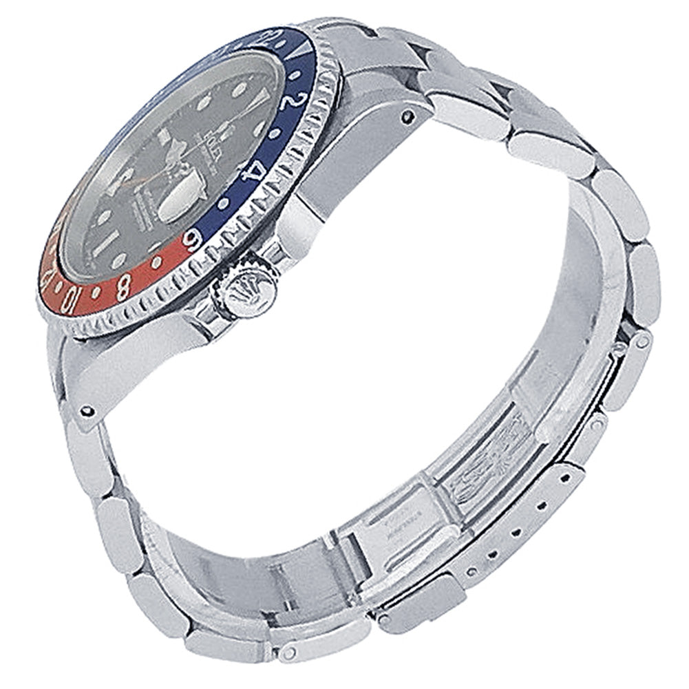 Pre-Owned Watch. Rolex GMT-Master II Pepsi men’s watch circa 2000 with Stainless Steel case and Oyster bracelet. Watch has a black dial with date feature and pepsi bezel. Watch runs on automatic movement. Watch can fit up to a size 6½ inch wrist. Watch has signs of wear (hairline scratches). Watch does come with box and papers.