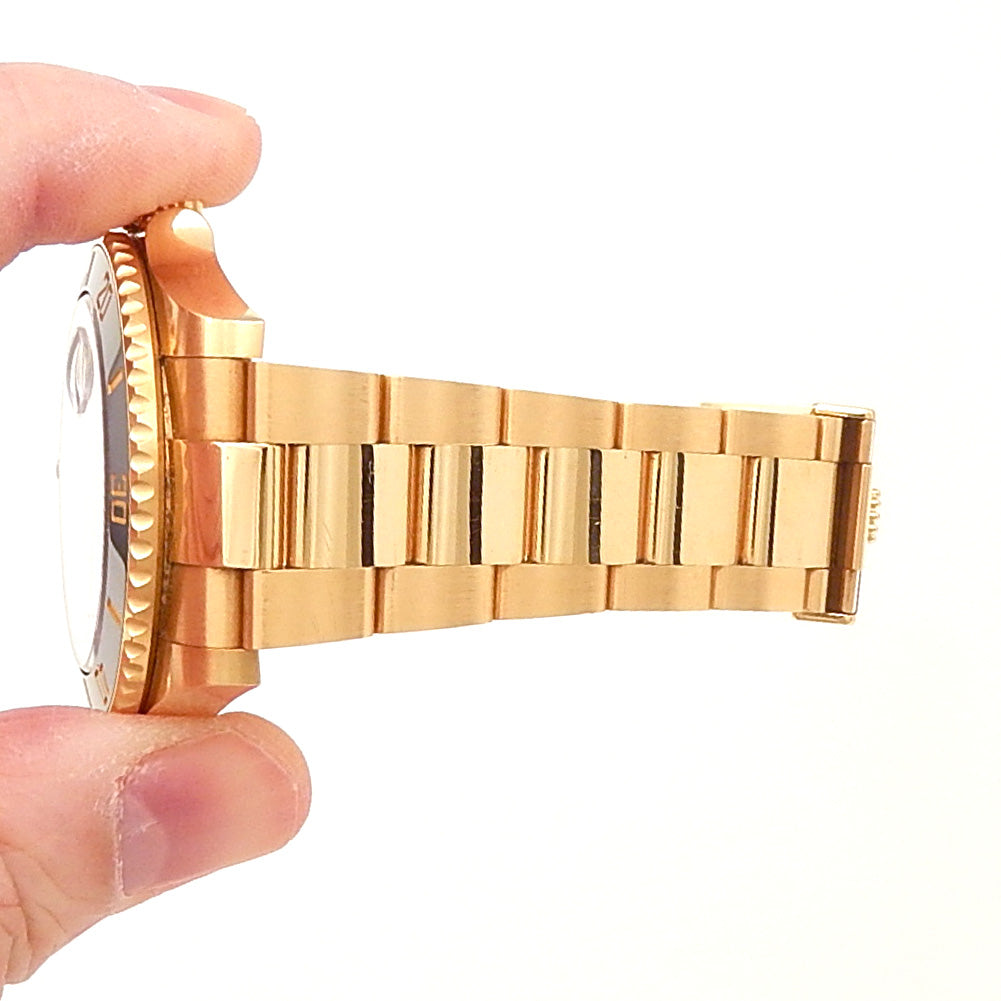 Pre-Owned Watch. Rolex Submariner Date men’s watch with 18k Yellow Gold case and Oyster bracelet. Watch has a black dial with date feature. Watch runs on automatic movement. Watch can fit up to a size 7½ inch wrist. Watch has signs of wear (hairline scratches). Watch does come with box and card.
