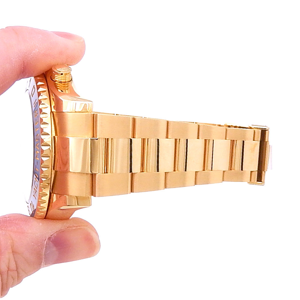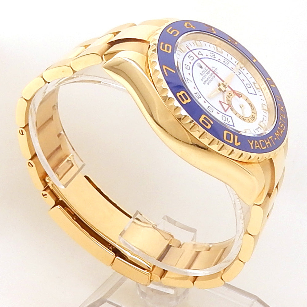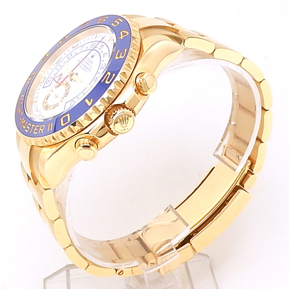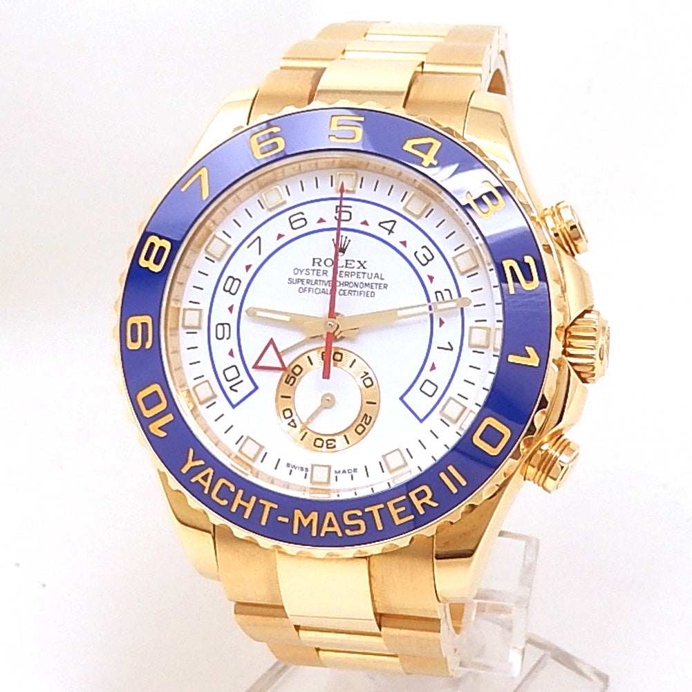 Pre-Owned Watch. Rolex Yacht-Master II men’s watch circa 2008 with 18k Yellow Gold case and Oyster bracelet. Watch has a white dial with a small seconds subdial. Watch runs on automatic movement. Watch can fit up to a size 7¾ inch wrist. Watch has signs of wear (hairline scratches). Watch does come with box and card.